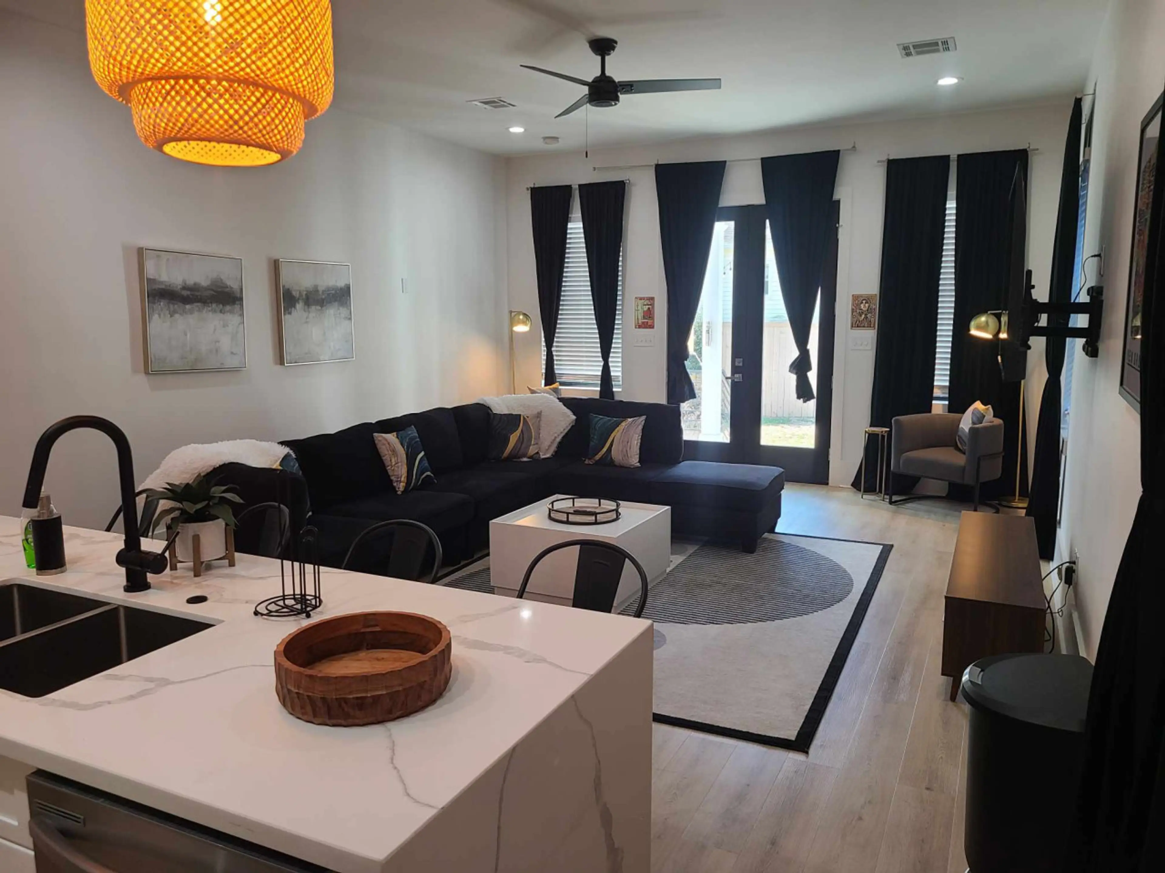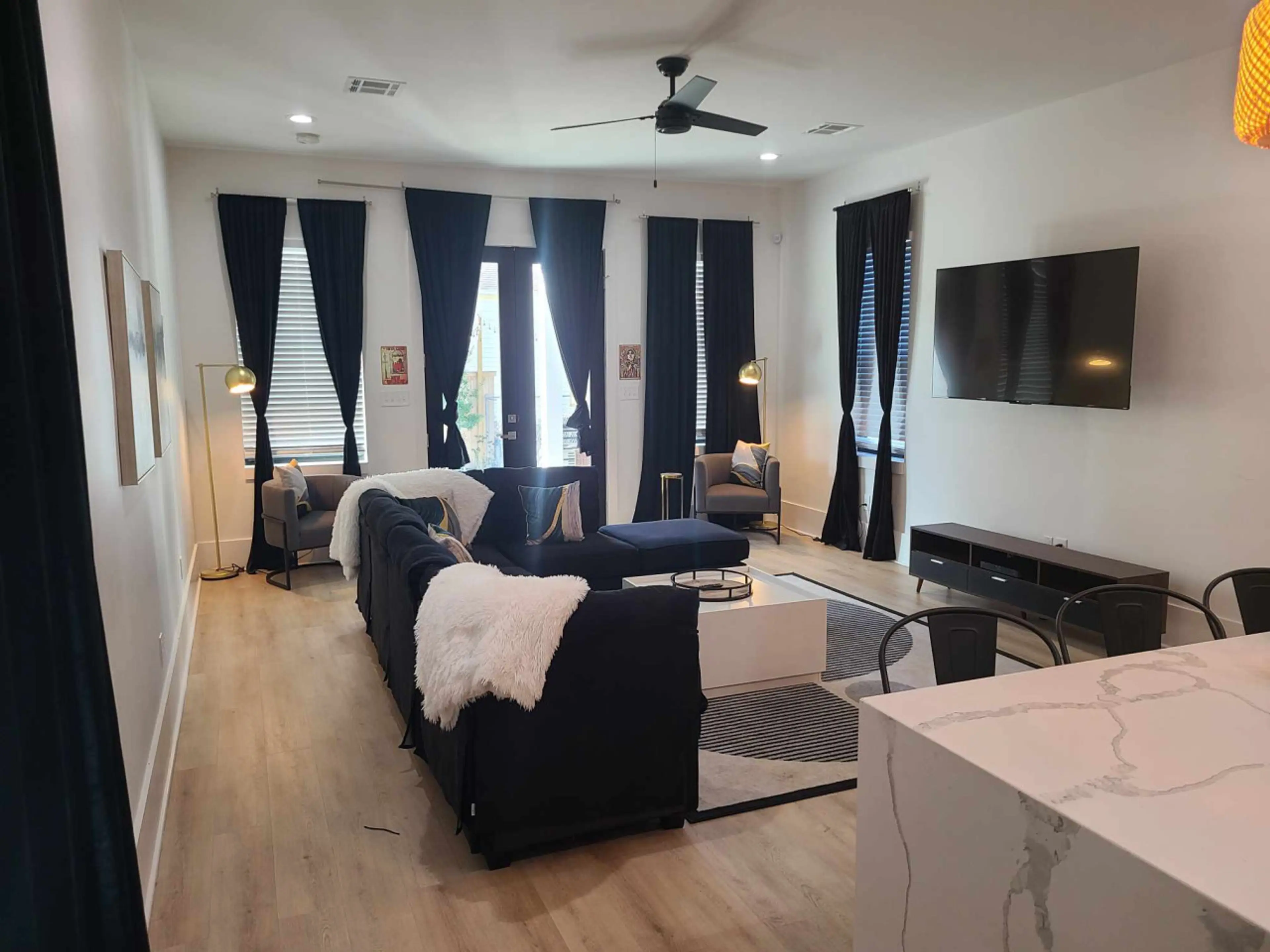 This stunning new construction boasts 5 bedrooms, 6 beds, private yard, off-street parking, large gathering space and wall mounted TVs in all bedrooms. This home is just 5 blocks to the streetcar line, and is just a 20 minute walk to the Superdome! Three of the rooms feature king beds! There are hai...